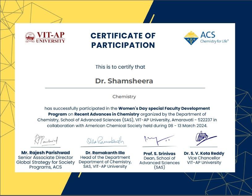 Dr. Shamsheera K O participated in the Women’s Day special Faculty Development Program on Recent Advances in Chemistry organized by the Department of Chemistry,School of Advanced Sciences (SAS),VIT-AP University, Amaravati in collaboration with American Chemical Society held during 08-13 March 2024
