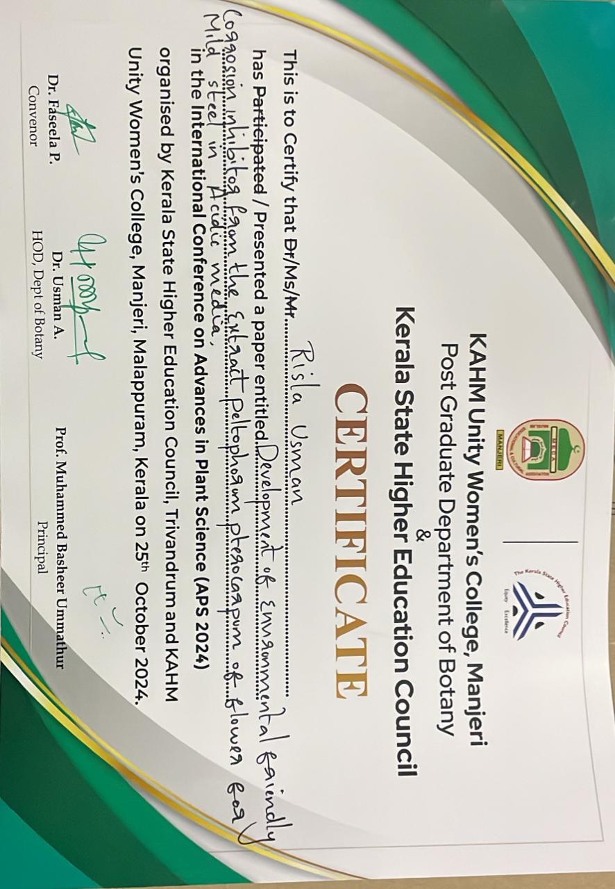 Risla Usman (M.Sc. Chemistry, 2022–24 batch) presented a paper titled “Development of an Environment Friendly Corrosion Inhibitor from the Ethanolic Extract of Peltophorum pterocarpum Flower for Mild Steel in ...
