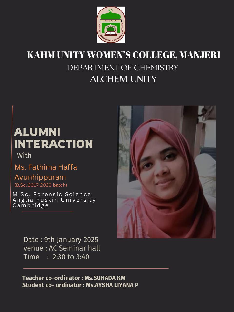 Alumni Interaction with Ms. Fathima Haffa Date: 09/01/2025Time: 2:30 PMVenue: Seminar Hall, KAHM Unity Women’s College, ManjeriAn inspiring alumni interaction session was organized by the Department of Chemistry on 9th January 2025. The session featured Ms. Fathima Haffa Avunhippuram, an accomplished alumna ...