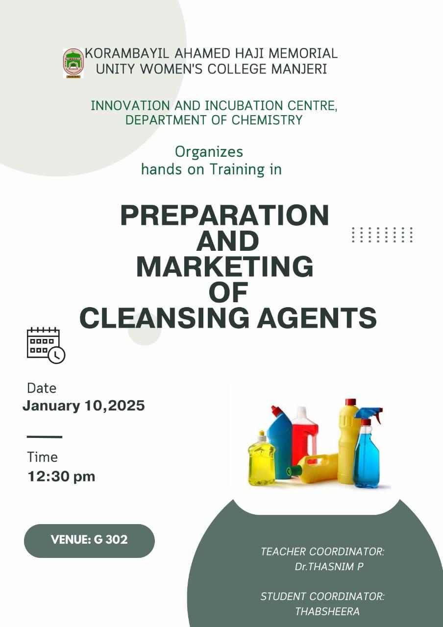 Hands-on Training in Preparation and Marketing of Cleansing Agents The Innovation and Incubation Center, Department of Chemistry, organized a hands-on training session on January 10, 2025. Participants prepared ...