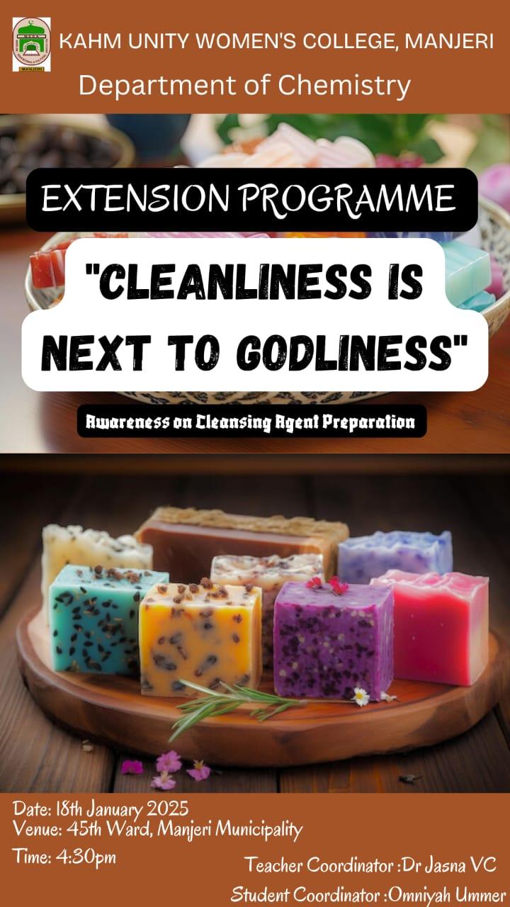 Extension Program "Cleanliness is Next to Godliness" The Department of Chemistry, KAHM Unity Women's College, Manjeri, organized an extension program titled "Cleanliness is Next to Godliness" on 18.01.2025, 4.30 pm. This ...
