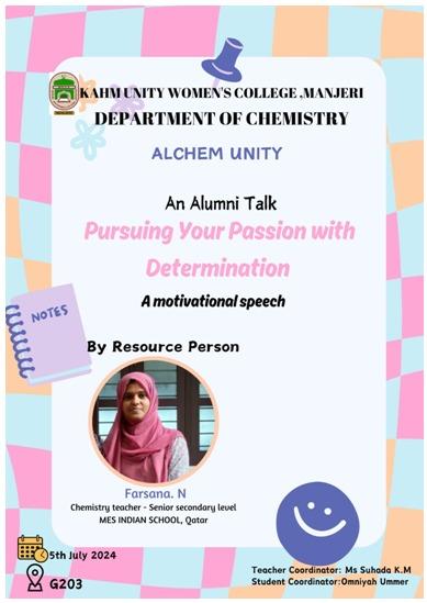 The Department of Chemistry at KAHM Unity Women’s College, Manjeri, in association with Alchem Unity, hosted an alumni interaction on 27th August 2024, featuring Ms.Shaima TP, a BSc Chemistry alumna (2018-2021), ...