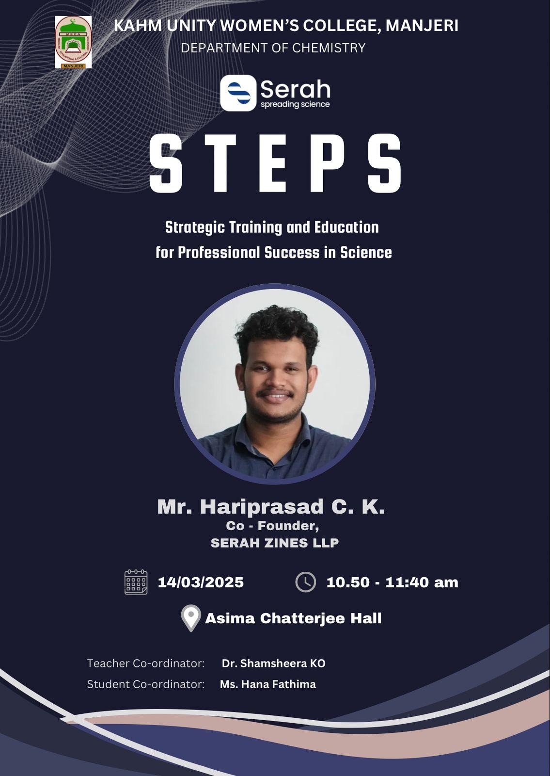 CAREER GUIDANCE LECTUREOn March 13, 2025, the Department of Chemistry, in collaboration with Serah Academy, organized a career guidance program titled STEPS (Strategic Training and Education for Professional Success in ...