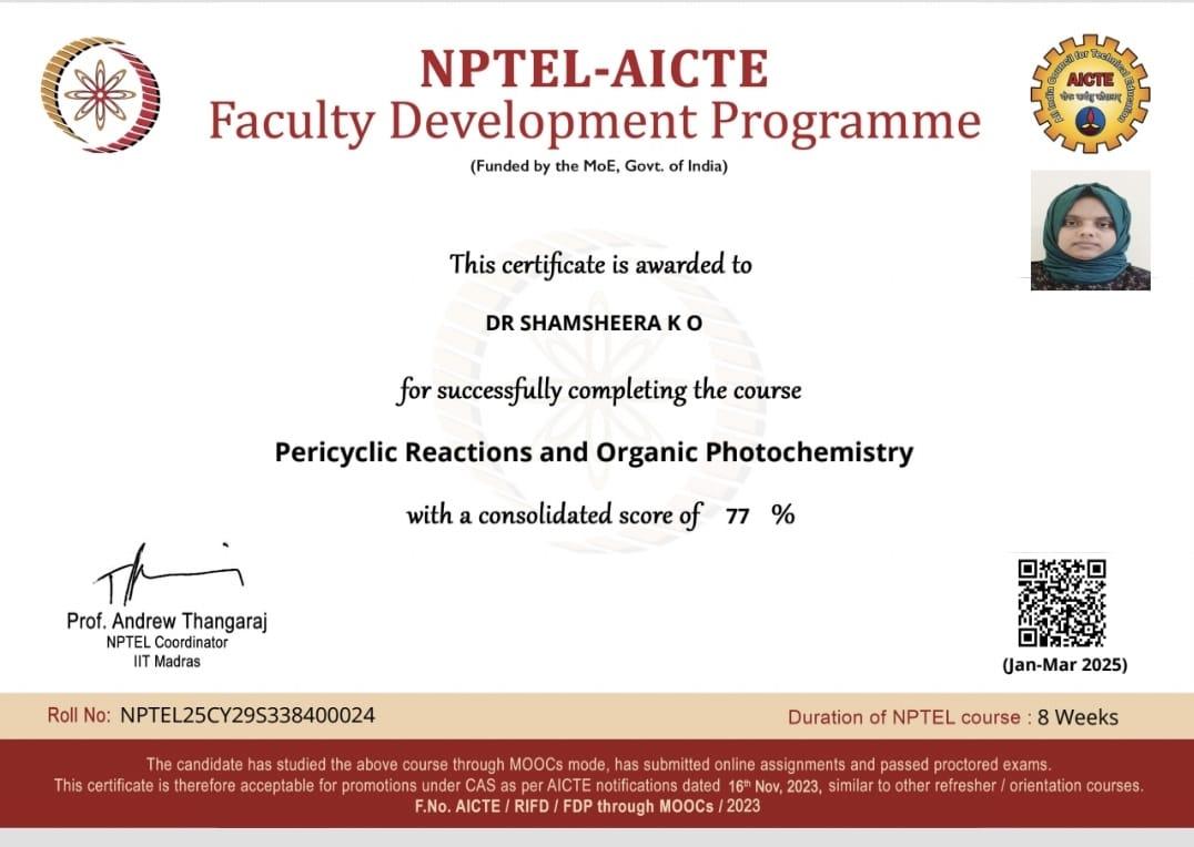 Dr. Thasnim P, Assistant Professor, Department of Chemistry completed an NPTEL SWAYAM certificate course on 'Advanced Organometallic Chemistry' offered by IIT Bombay.