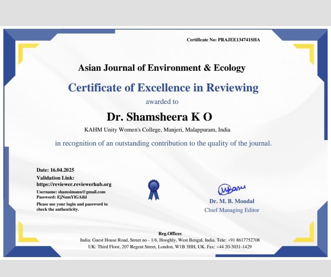 Dr. Shamsheera K. O., Assistant Professor in the Department of Chemistry, served as a peer reviewer for the Asian Journal of Environment and Ecolog