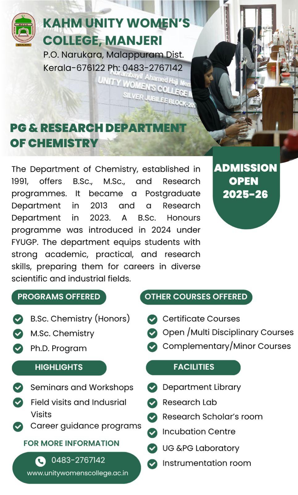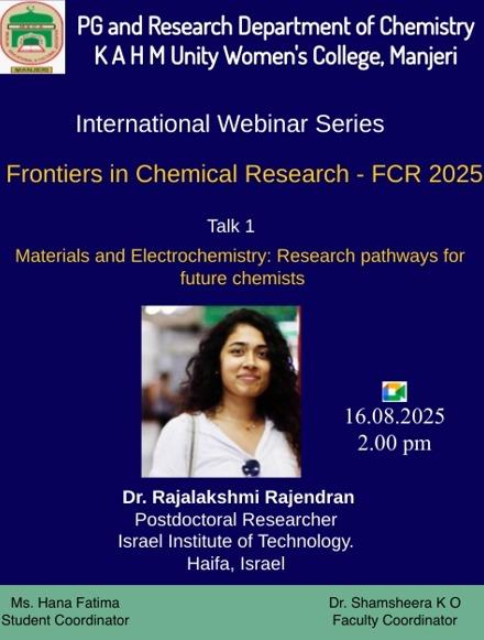 The Post Graduate Department of Chemistry at KAHM Unity Women’s College, Manjeri,organized a career guidance lecture titled “FutureChem: Navigating Careers in Chemistry” on27 th August 2024, at 11:30 ...