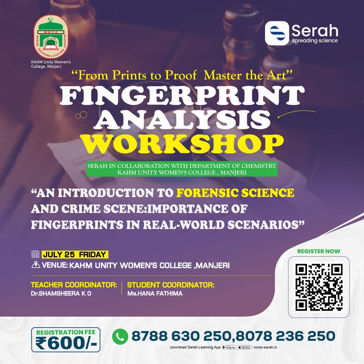 The PG and Research Department of Chemistry, in collaboration with Serah Zines LLP, Calicut, conducted a Fingerprint Analysis Workshop on 25th July 2025. The workshop aimed to introduce students to the scientific and ...