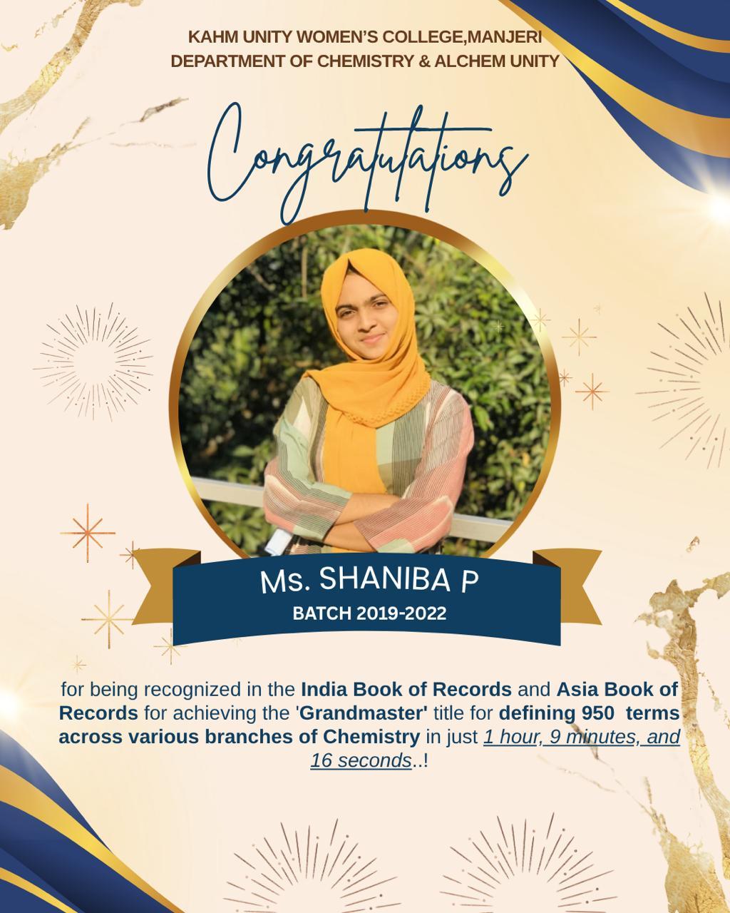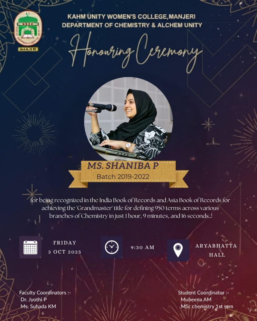 The Department of Chemistry and its alumni association ALCHEM UNITY of KAHM Unity Women’s College, Manjeri organized an Honouring Ceremony for Ms. Shaniba P, a proud alumna of the department and winner of the India ...