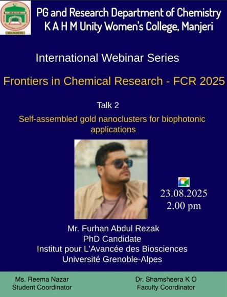 The second talk of the International Webinar Series on Frontiers in Chemical Research (FCR 2025) was chaired by Dr. Thasnim P. The session featured Mr. Furhan Abdul Rezak, PhD Candidate at Institut pour L'Avancée ...