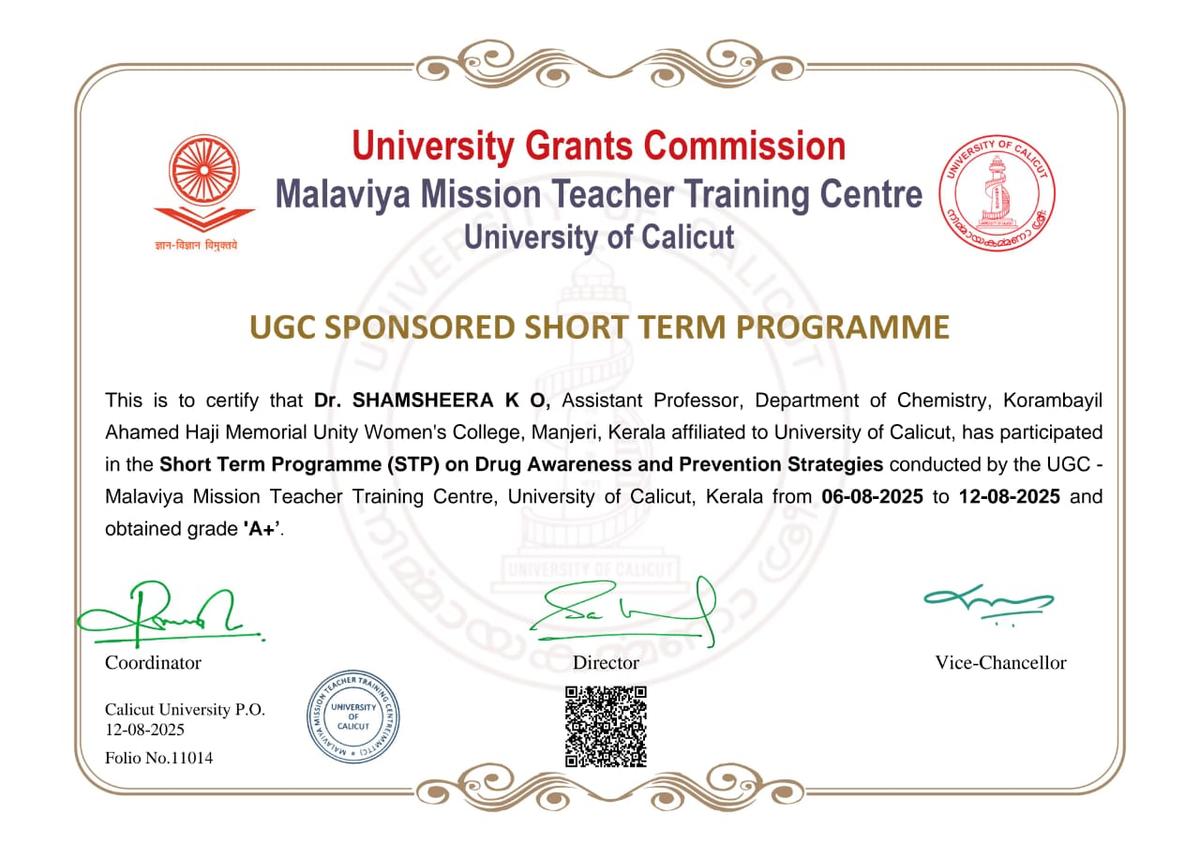 Dr. Shamsheera K O, Assistant Professor, Department of Chemistry, participated in the Short-Term Course on Drug Awareness and Its Prevention Methods conducted by UGC-MMTTC, University of Calicut, from 6th to 12th August ...