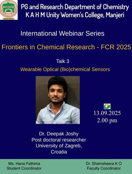 The third talk of the International Webinar Series FCR 2025 was held on 13th September 2025, chaired by Dr. Jyothi P. The session was delivered by Dr. Deepak Joshy, Postdoctoral Researcher at the Faculty of Chemical ...