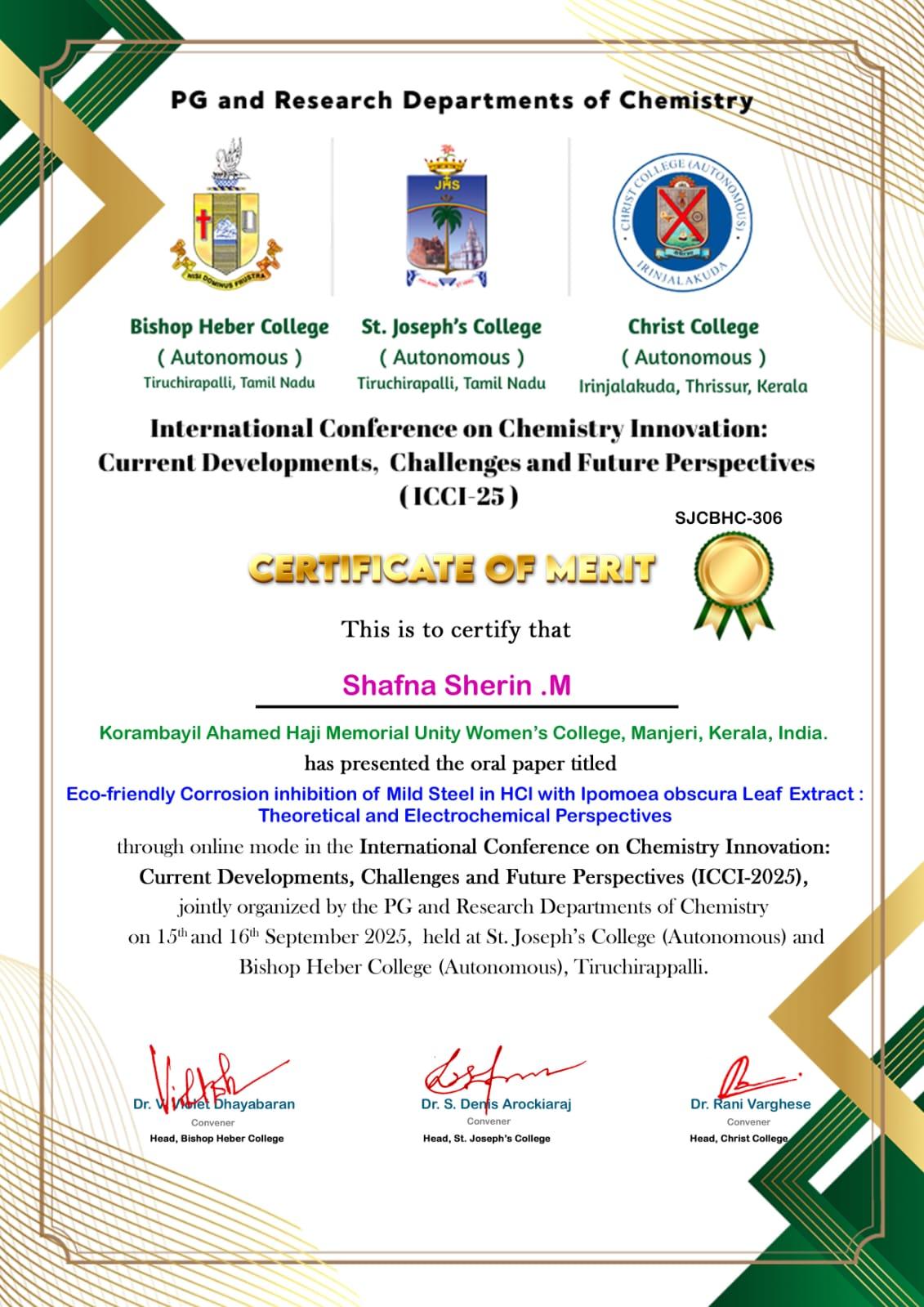 Ms. Shafna Sherin M. (M.Sc. Chemistry, 2023–25 batch) presented a paper titled “Eco-friendly Corrosion Inhibition of Mild Steel in HCl with Ipomoea obscura Leaf Extract: Theoretical and Electrochemical ...