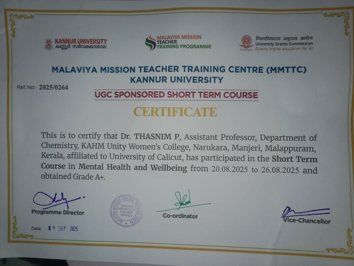Dr. Thasnim P, Department of Chemistry, participated in the short term course in Mental Health and well being from 20.08.2025 to 26.08.2025 organized by MMTTC, Kannur University.