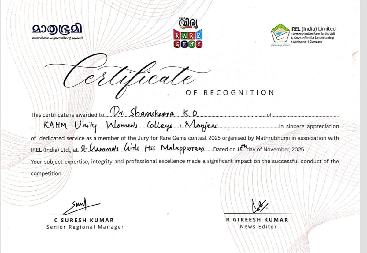 Dr. Shamsheera K O served as a jury member for the Rare Gems Contest 2025 organized by Mathrubhumi and IREL (India) Ltd., held on 15 November 2025 at St. Gemma's Girls HSS, Malappuram.