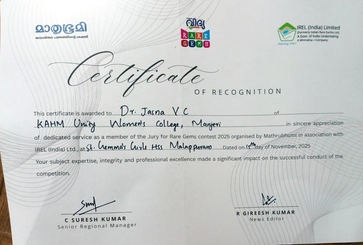 Dr. Jasna V C served as a jury member for the Rare Gems Contest 2025 organized by Mathrubhumi and IREL (India) Ltd., held on 15 November 2025 at St. Gemma's Girls HSS, Malappuram.