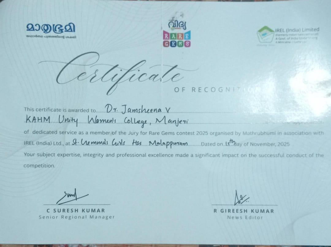 Dr. JamsheenaV served as a jury member for the Rare Gems Contest 2025 organized by Mathrubhumi and IREL (India) Ltd., held on 15 November 2025 at St. Gemma's Girls HSS, Malappuram.