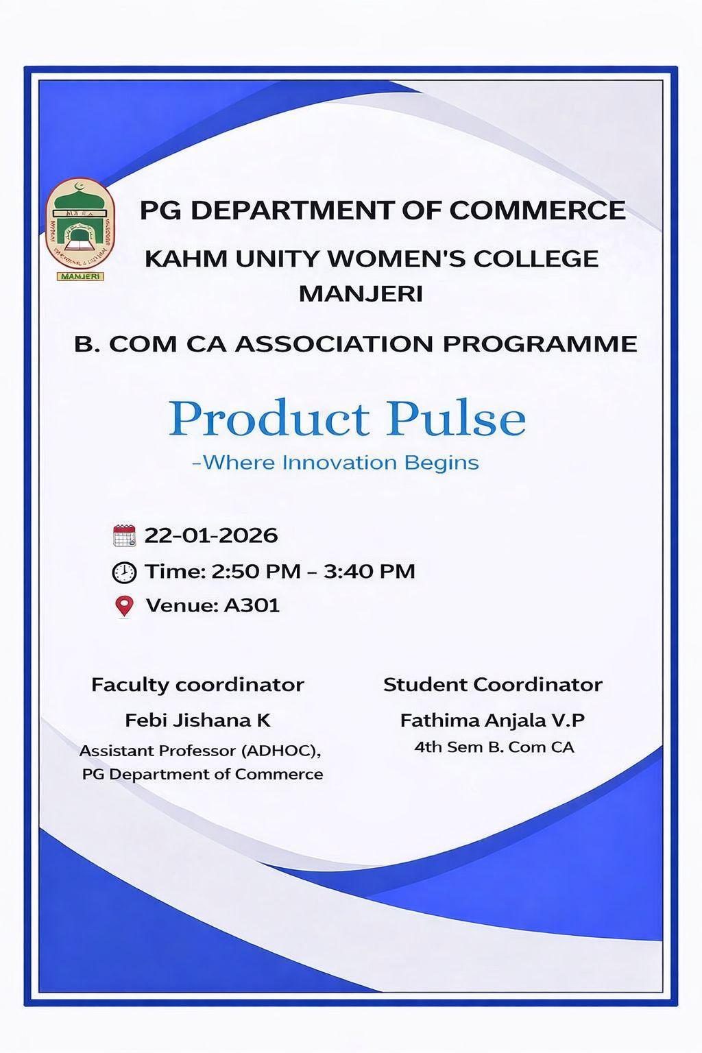 The PG Department of Commerce, KAHM Unity Women’s College, Manjeri, organized association programme titled “Product Pulse – Where Innovation Begins” on 22 January 2026. The event was ...