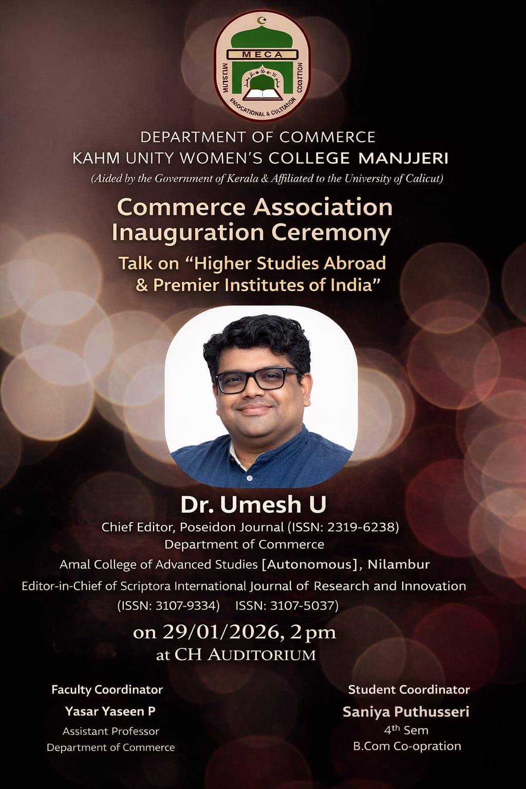 The Department of Commerce, KAHM Unity Women's College, Manjeri formally inaugurated its Commerce Association activities for the academic year 2025-26 on 29th January 2026. The event, held at the CH Auditorium, was ...