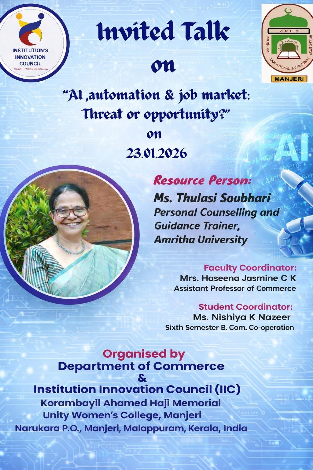 The Department of Commerce, in collaboration with the Institution Innovation Council (IIC) of KAHM Unity Women’s College, Manjeri, organized an invited talk on the topic “AI, Automation & the Job Market: ...