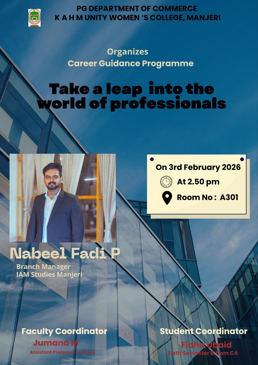 The PG Department of Commerce at KAHM Unity Women’s College successfully organised a Career Guidance Programme titled “Design Your Destiny” on 10 February 2026 at 2:40 PM in Room No. A301. The programme ...