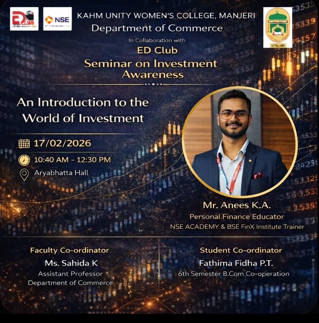 The Department of Commerce, KAHM Unity Women’s College, Manjeri, in collaboration with the ED Club, successfully organized a National Seminar on Investment Awareness on 17 th February 2026 at Aryabhatta Hall.The ...