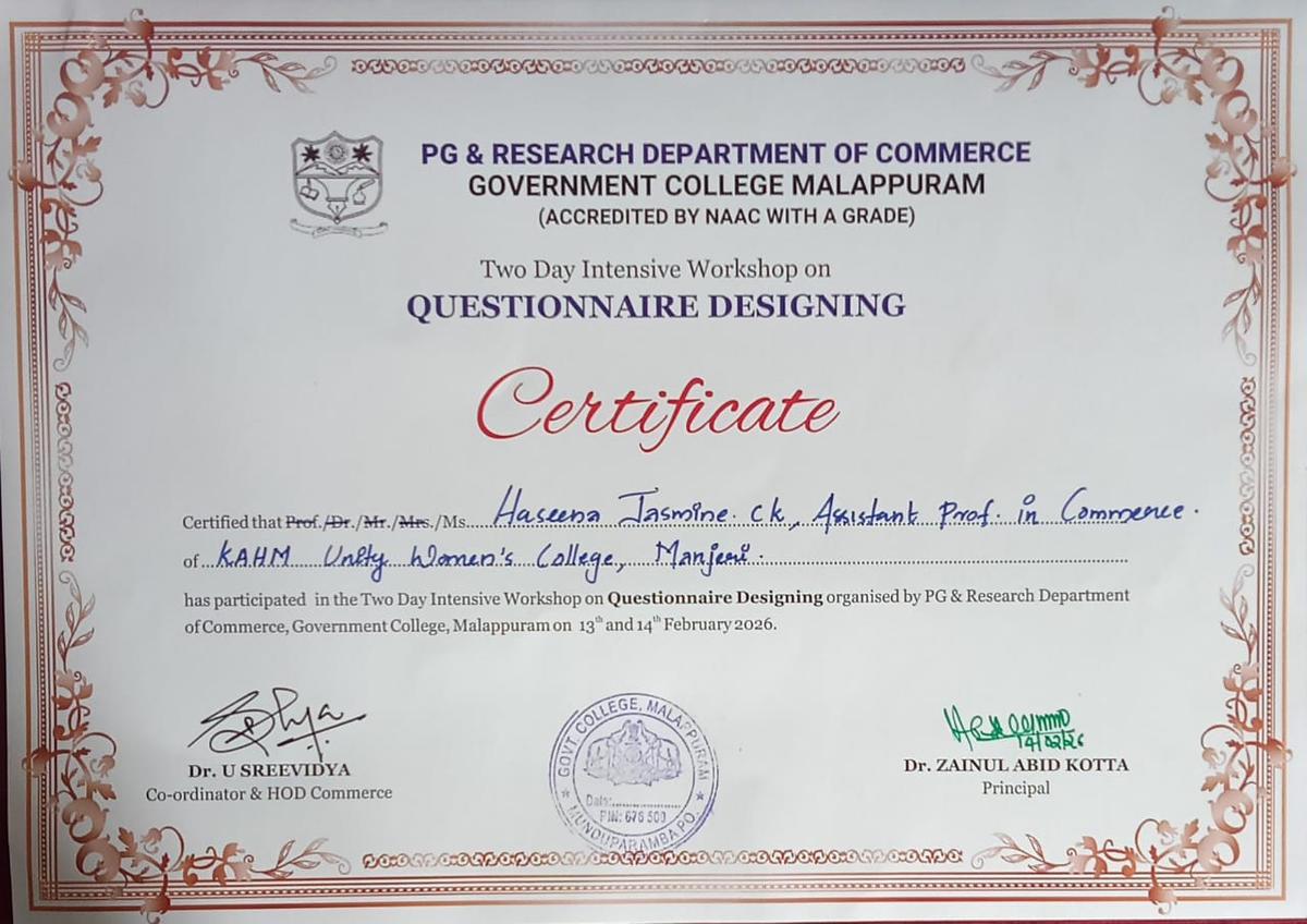 Ms. Haseena Jasmine C K, Assistant Professor of Commerce has participated in the Two-day Intensive Workshop on “Questionnaire Designing” organized by the PG & Research Department of Commerce, ...
