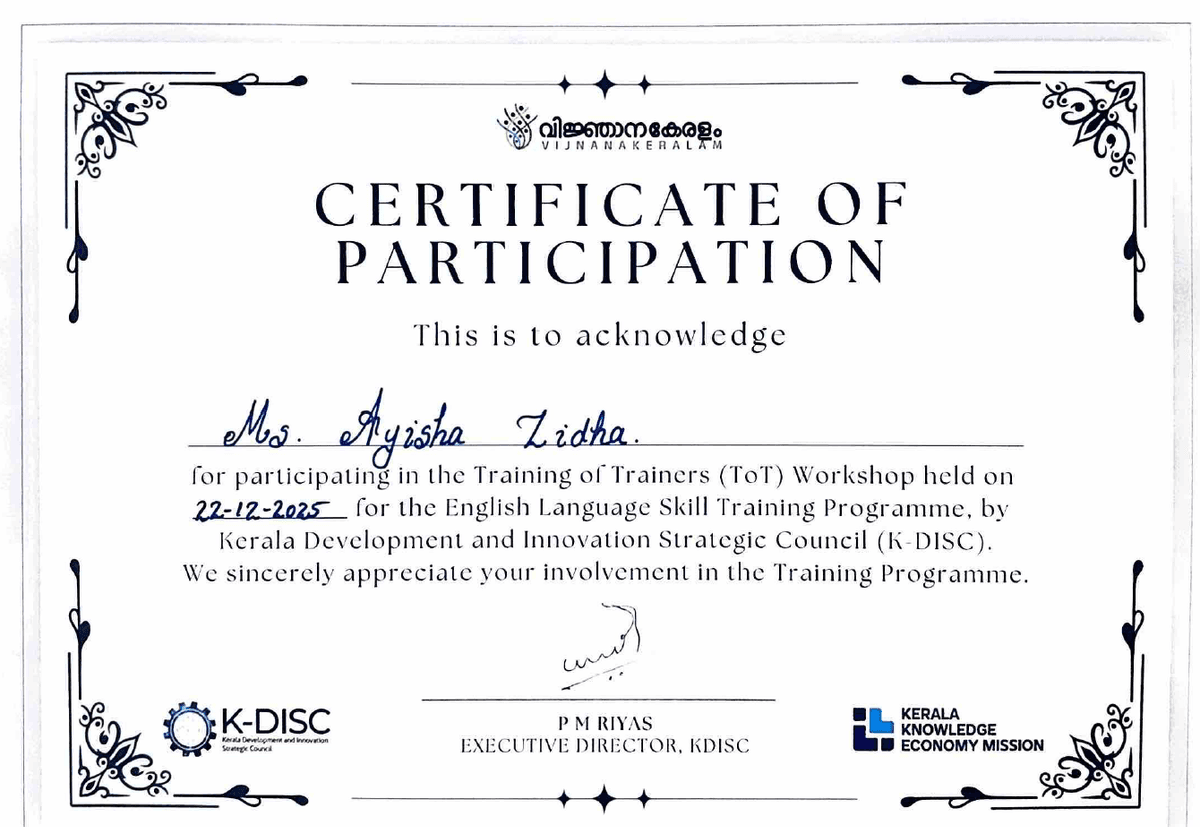 Ms Ayisha Zidha of the PG and Research Department of English, participated in the Training of Trainers (ToT) Workshop conducted under the English Language Skill Training Programme on 22 December 2025 at Kochi. The workshop was organized by Kerala Development and Innovation Strategic Council (K-DISC), Government of ...