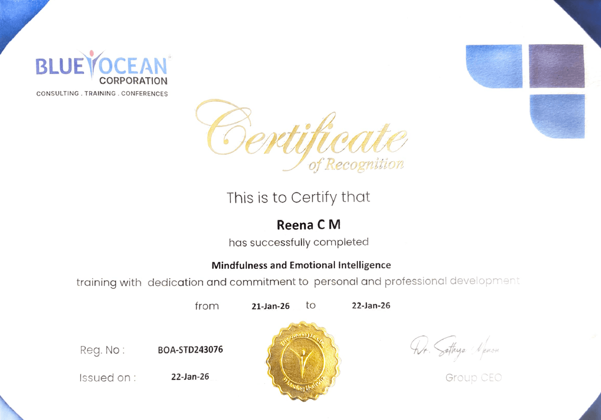 Ms. Reena C M, Assistant Professor, PG and Research Department of English., attended 2 day training on Mindfulness and Emotional Intelligence from 21/01/2026 to 22/02/2026 conducted by Blue Ocean Corporation, Dubai.