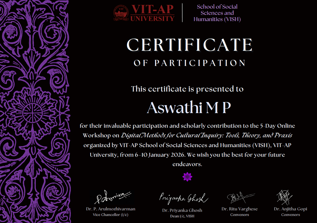 Dr. Aswathi M. P., Associate Professor, Department of English, KAHM Unity Women's College, Manjeri participated in Online National Workshop on Digital Methods for Cultural Inquiry: Tools, Theory, and PraxisSchool of ...