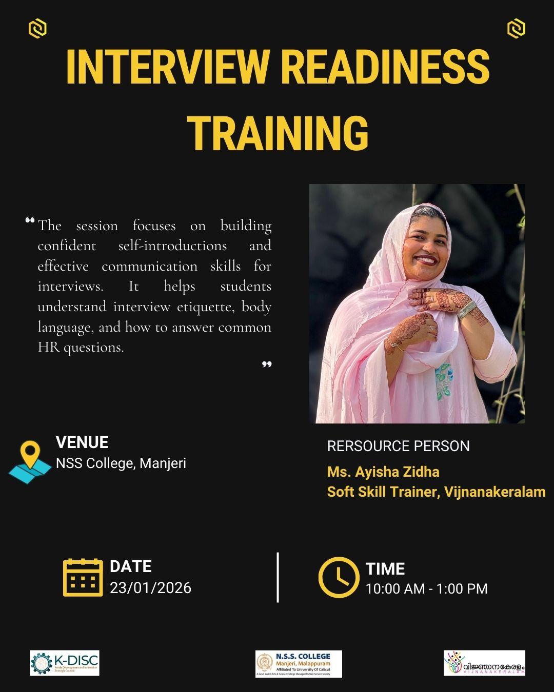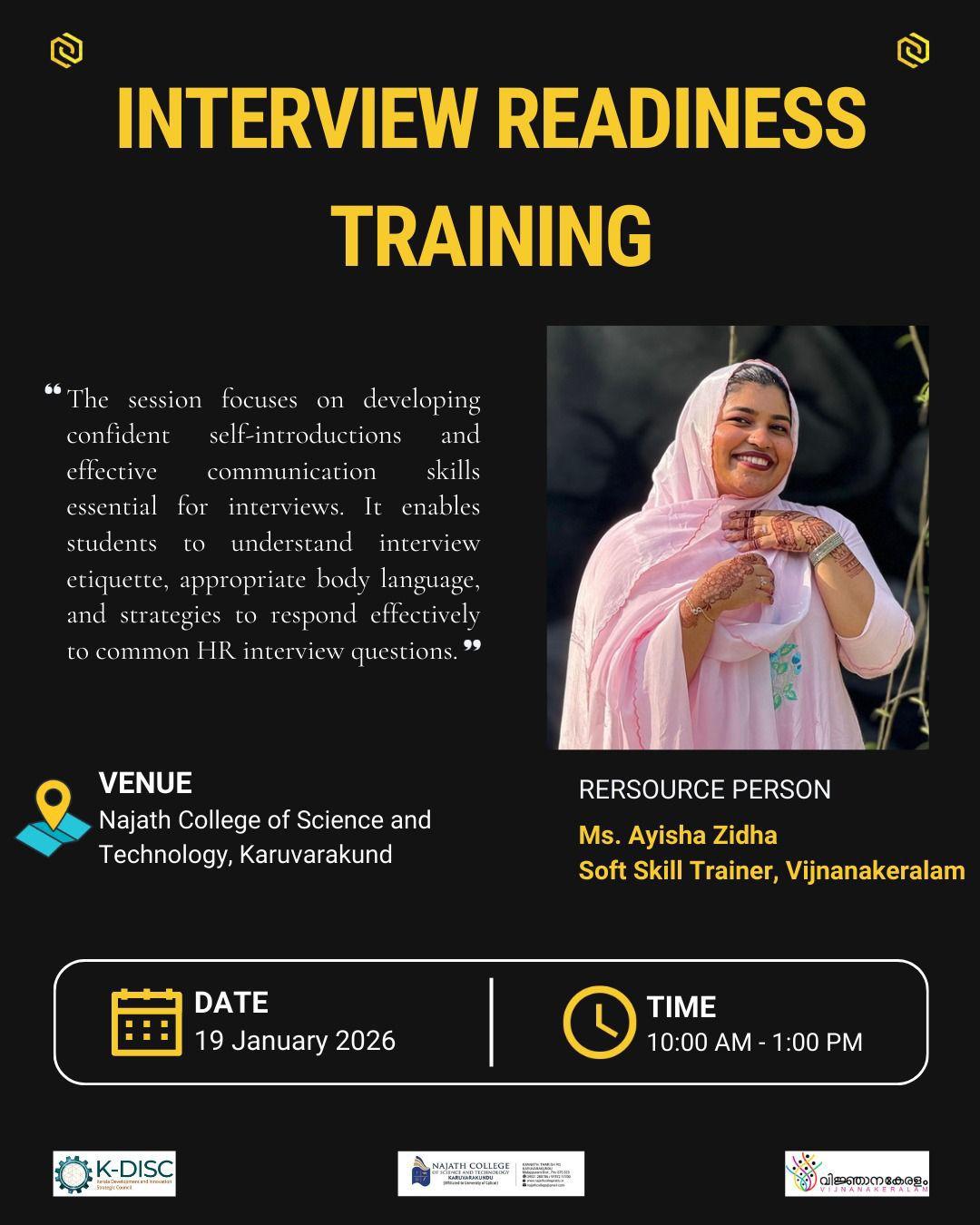 Ms Ayisha Zidha of the PG and Research Department of English, delivered a session on “Interview Readiness” for degree final year students at Najath College of Science and Technology, Karuvarakund on 19th January 2026. The session was organized by Kerala Development and Innovation Strategic ...
