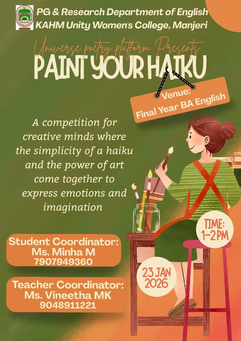 The PG and Research Department of English conducted a competition titled “Paint Your Haiku” on 23rd January,2026. Coordinated by the final year BA English students under Universe, a platform for poetry, the ...