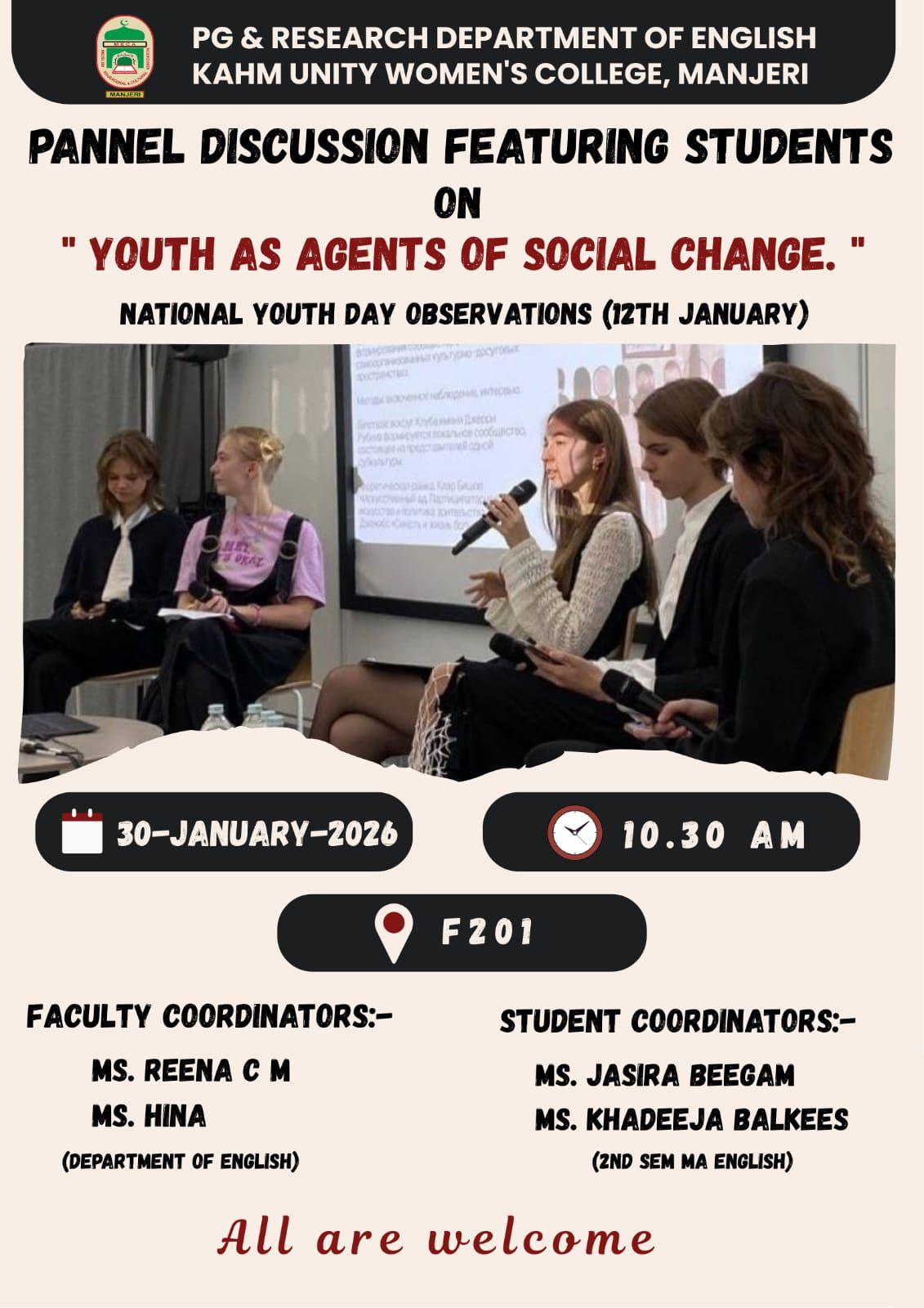 PG and Research Department of English, KAHM Unity Women's College, Manjeri, hosted a panel discussion on "Youth as Agents of Social Change" as part of National Youth Day celebrations. The event featured students from ...