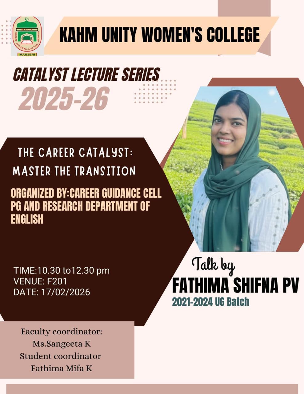 The Career Guidance Cell and PG & Research Department of English of KAHM Unity Women’s College organized a session under the Catalyst Lecture Series 2025–26 on 17 February 2026 at 10.30 AM at Vaikom ...