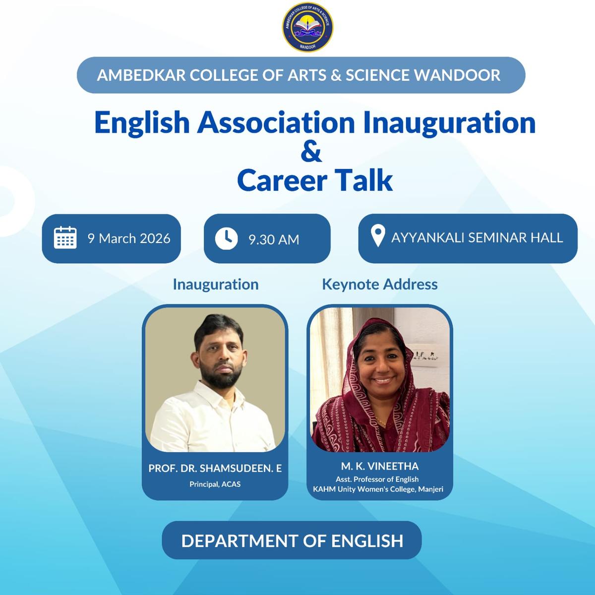 As a part of the English Association inauguration, Ms M.K. Vineetha of the PG and Research department of English delivered a talk on career prospects for English major students at Ambedkar College of Arts and Science, ...