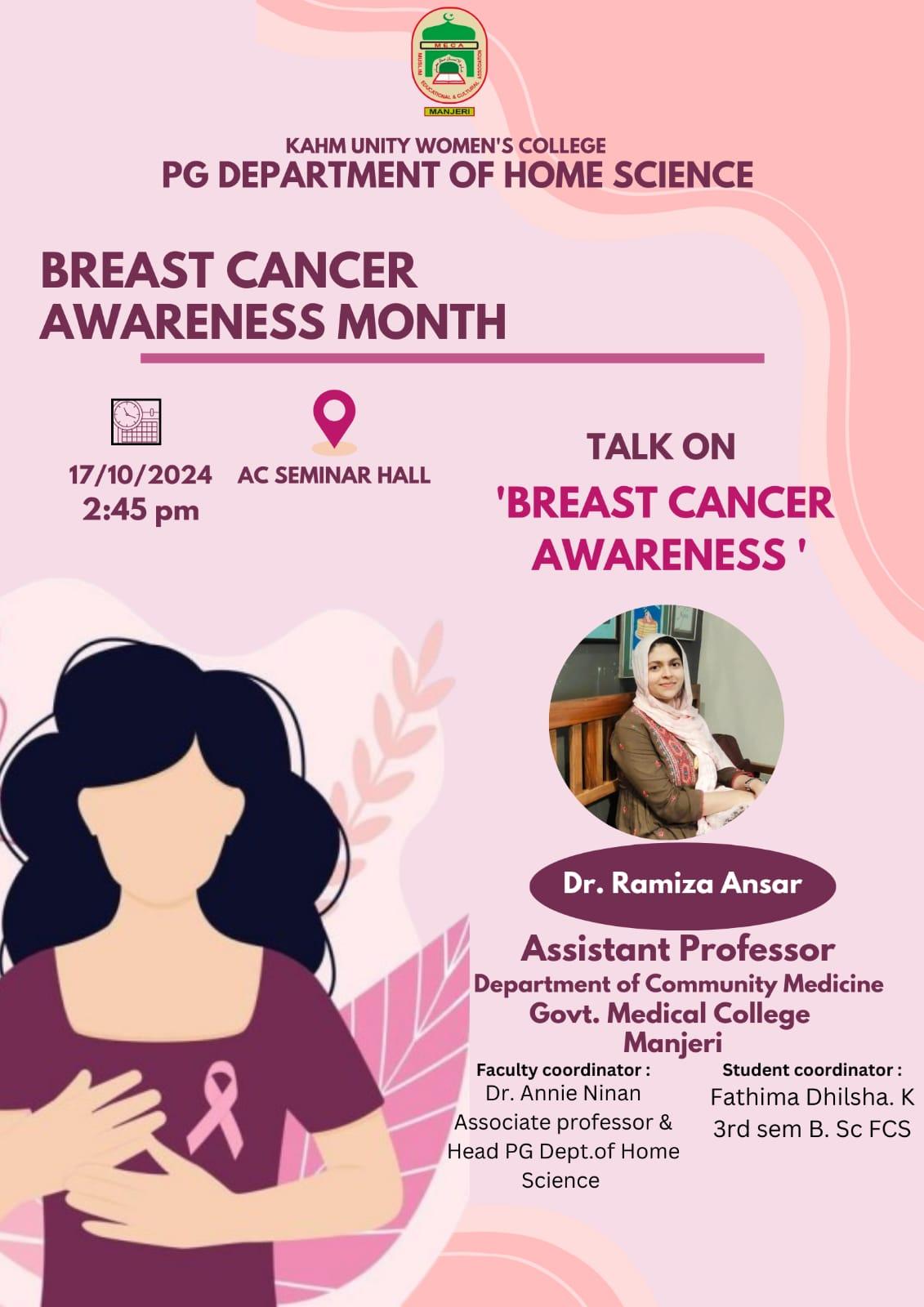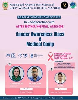 Breast Cancer Awareness Month is an annual observance held in the month of October. As a part of it, the PG department of Home Science in collaboration with Aster Mother Hospital, Areekode conducted a cancer awareness ...