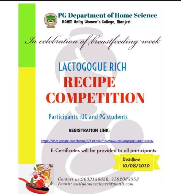 Dept. of Home Science conducted National level Lactogogue rich recipe competition for UG and PG students in connection with World Breastfeeding Celebration, 2020. 27 students participated in the competition. ...