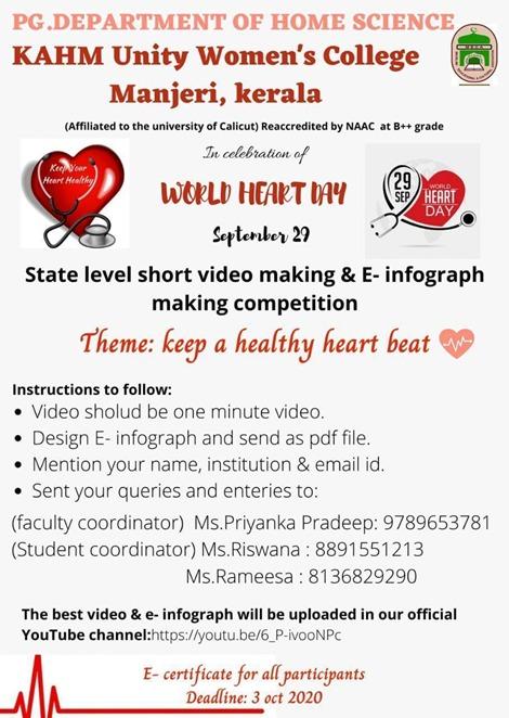 As part of World Heart Day Celebration, PG Department of Home Science organized State level short video making and E-Infograph making competition for students. The theme for the competition was “Keep a Healthy ...
