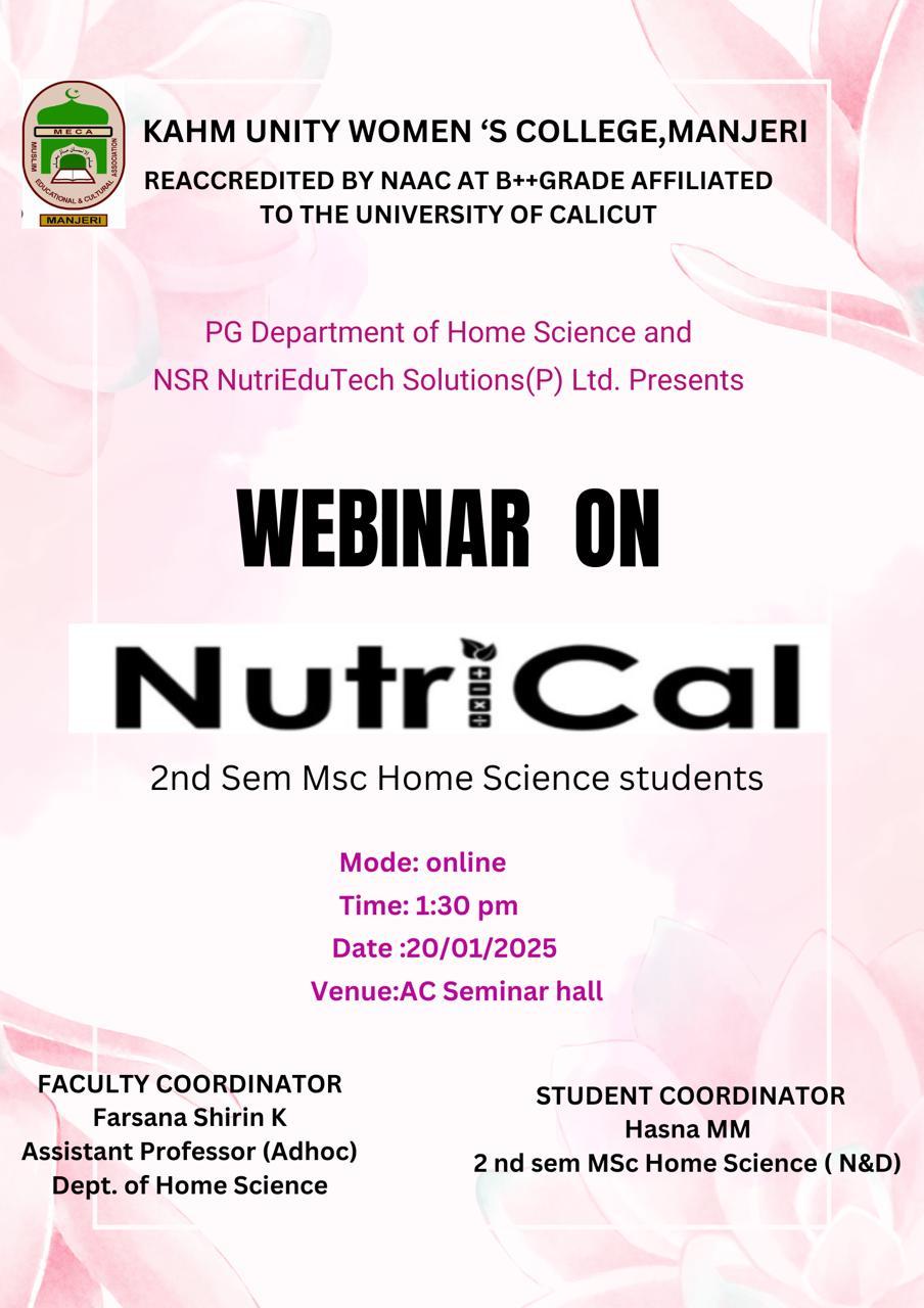 Webinar on NutriCal The PG Department of Home Science,in collaboration with NSR NutriEduTech Solutions (P) Ltd.conducted an online webinar on NutriCal on 14/06/2024.The resource person was Nikesh Kumar Jain, Co-founder & Head of Innovation & Technology, NSR NutriEduTech Solutions Pvt. Ltd. He is Masters in ...