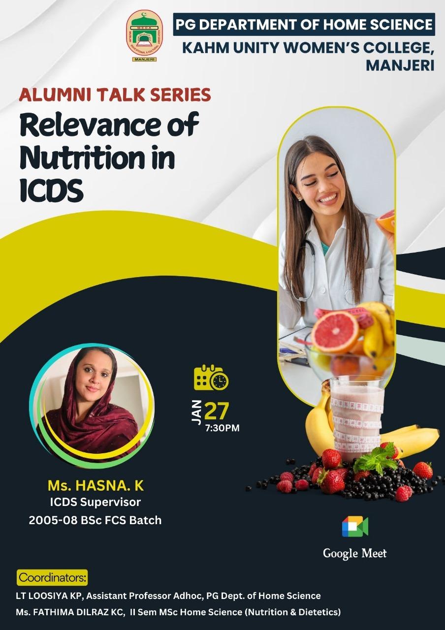 Alumni Talk Series - 4 on "Relevance of Nutrition in ICDS"27 Jan 2025 The PG Department of Home Science organized Alumni Talk Series - 4 on "Relevance of Nutrition in ICDS" on 27th January 2025, via Google Meet. The aim ...