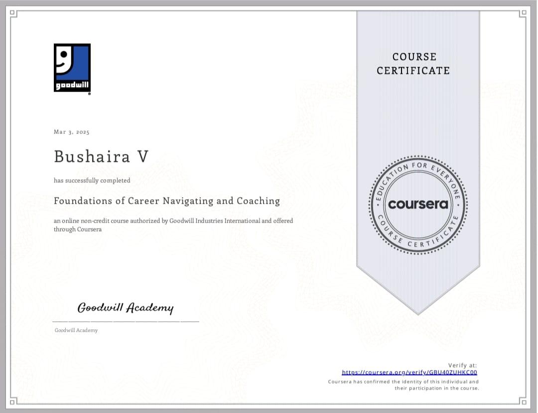 Ms. Bushaira V, Assistant Professor (Adhoc), Department of Home Science completed a course in Coursera entitled Foundations of Career Navigating and Coaching as a part of Talent Accelerator Programme, a joint venture of ...