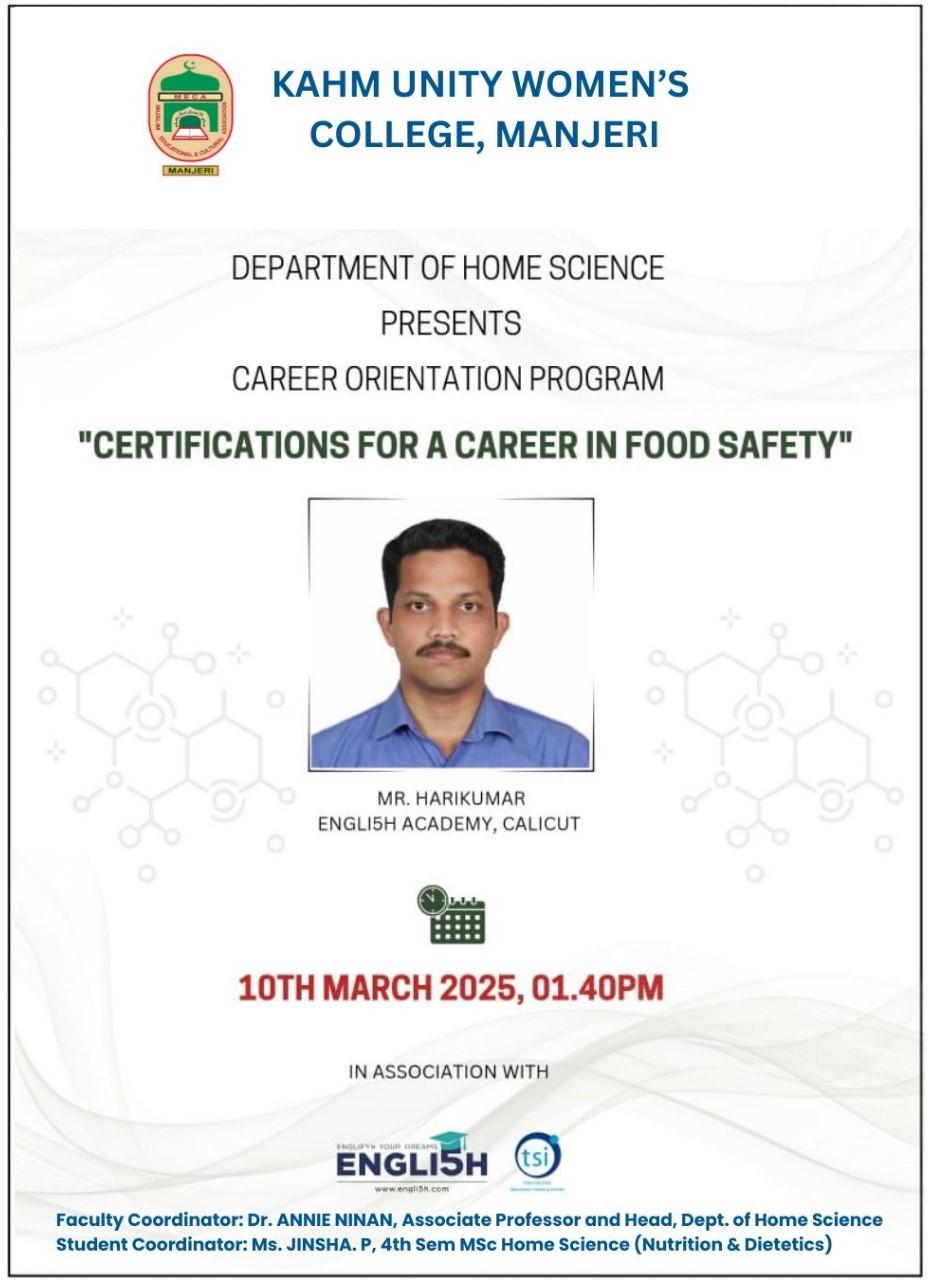 As part of department's commitment in providing students with industry relevant skills and knowledge , PG Department of Home Science conducted career orientation class on " Certifications for a Career in Food ...