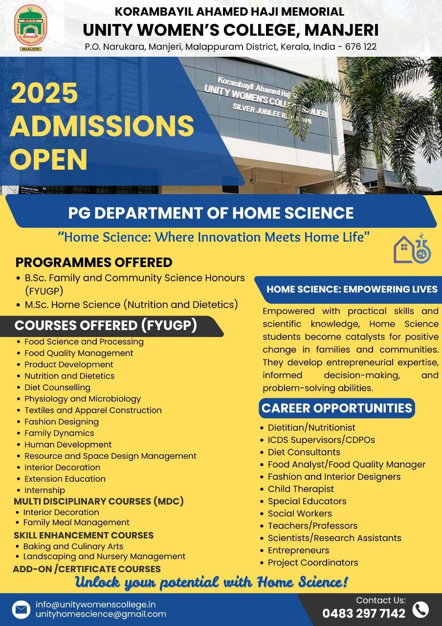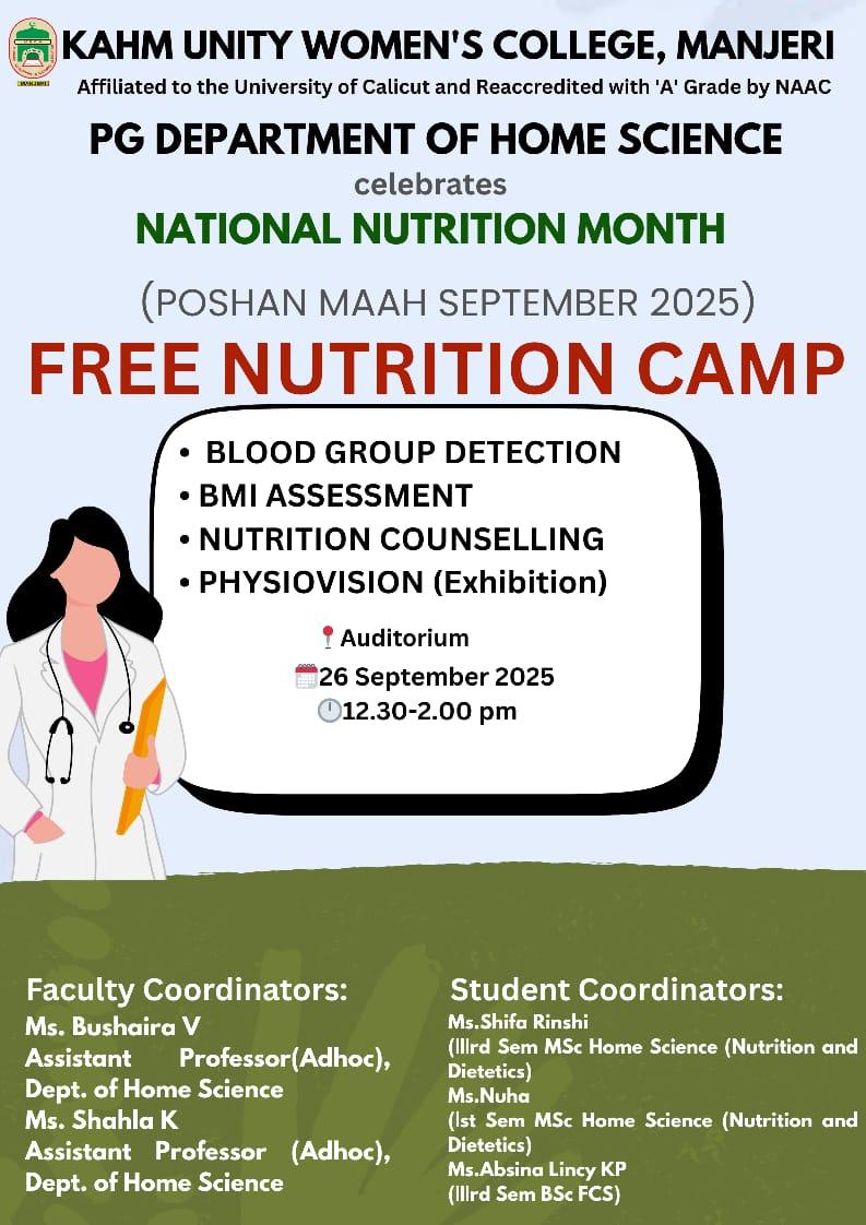 The PG Department of Home Science, KAHM Unity Women’s College, Manjeri, organized a Free Nutrition Camp on 26th September 2025 in connection with the observance of National Nutrition Month (Poshan Maah 2025). The ...