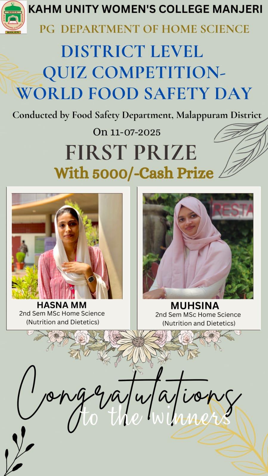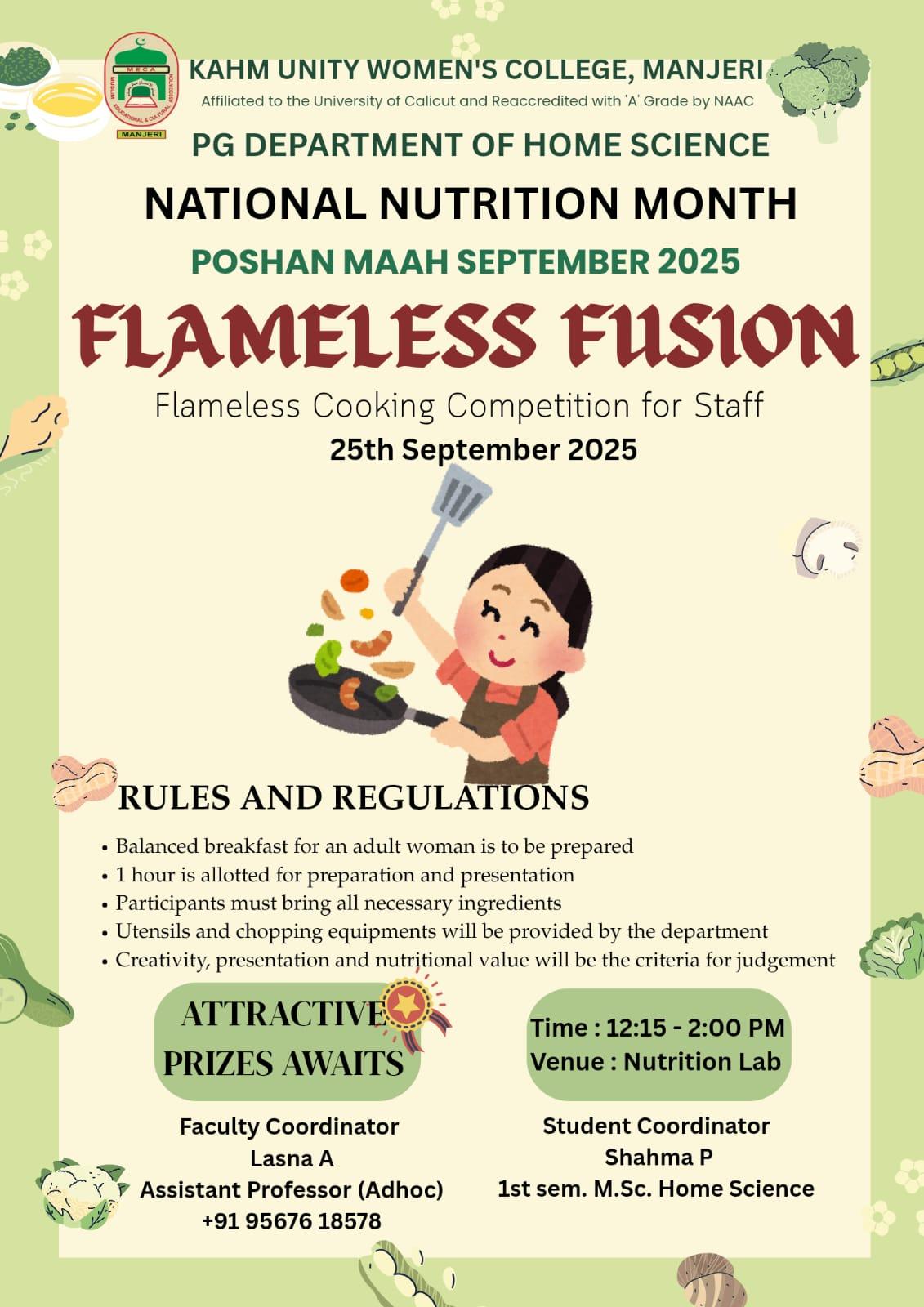 The PG Department of Home Science, KAHM Unity Women’s College, Manjeri, organized a cooking competition for staff entitled “Flameless Fusion” on September 25, 2025, as part of National Nutrition Month ...