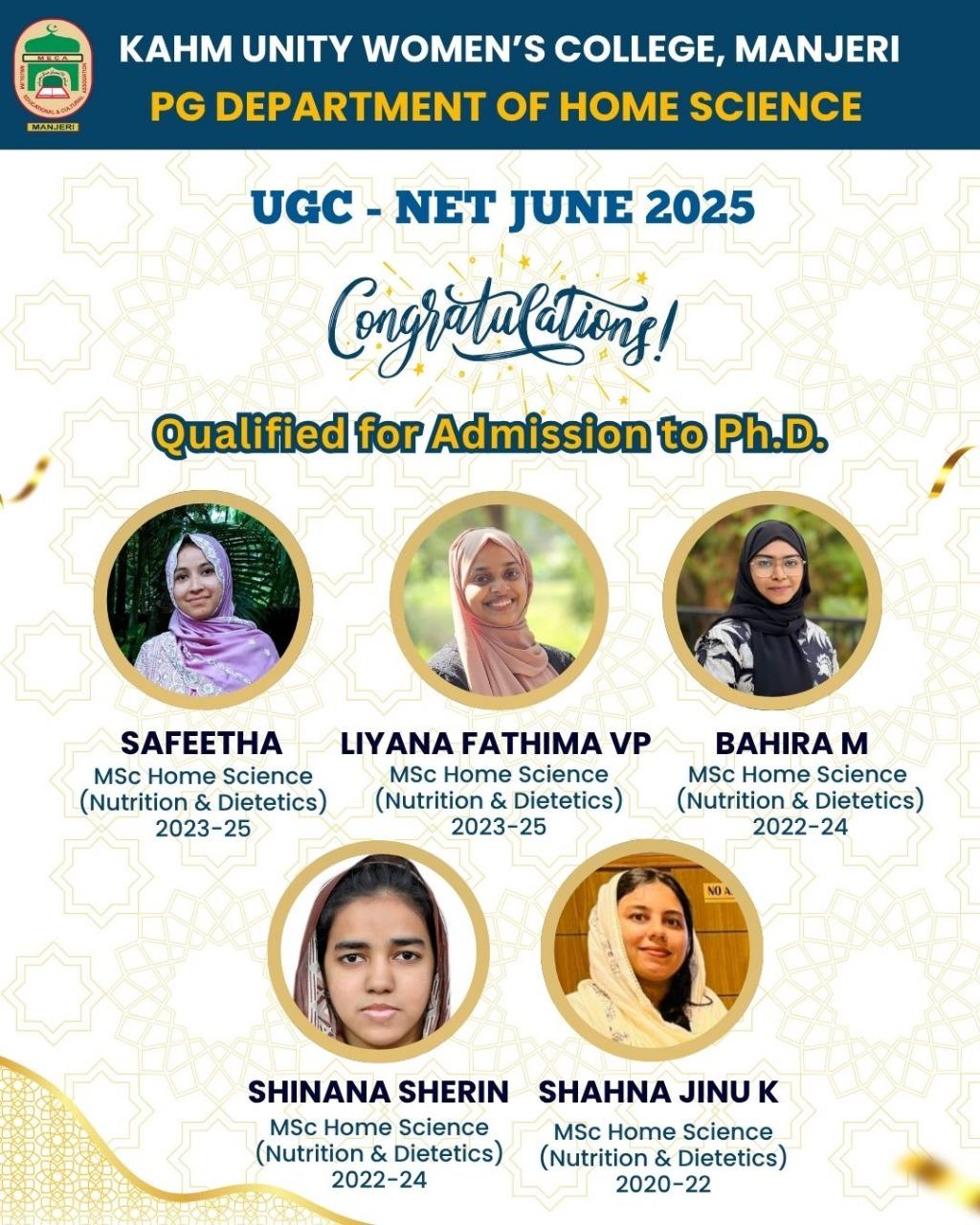 Congrats to our six achievers for qualifying UGC-NET June 2025 for Ph.D. admission!A proud moment for PG Department of Home Science, KAHM Unity Women’s College