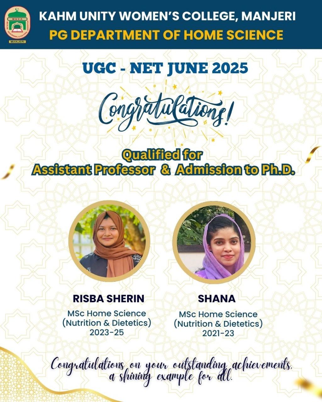 Congratulations to Risba Sherin & Shana for qualifying UGC-NET June 2025! 🌟Proud moment for PG Department of Home Science!