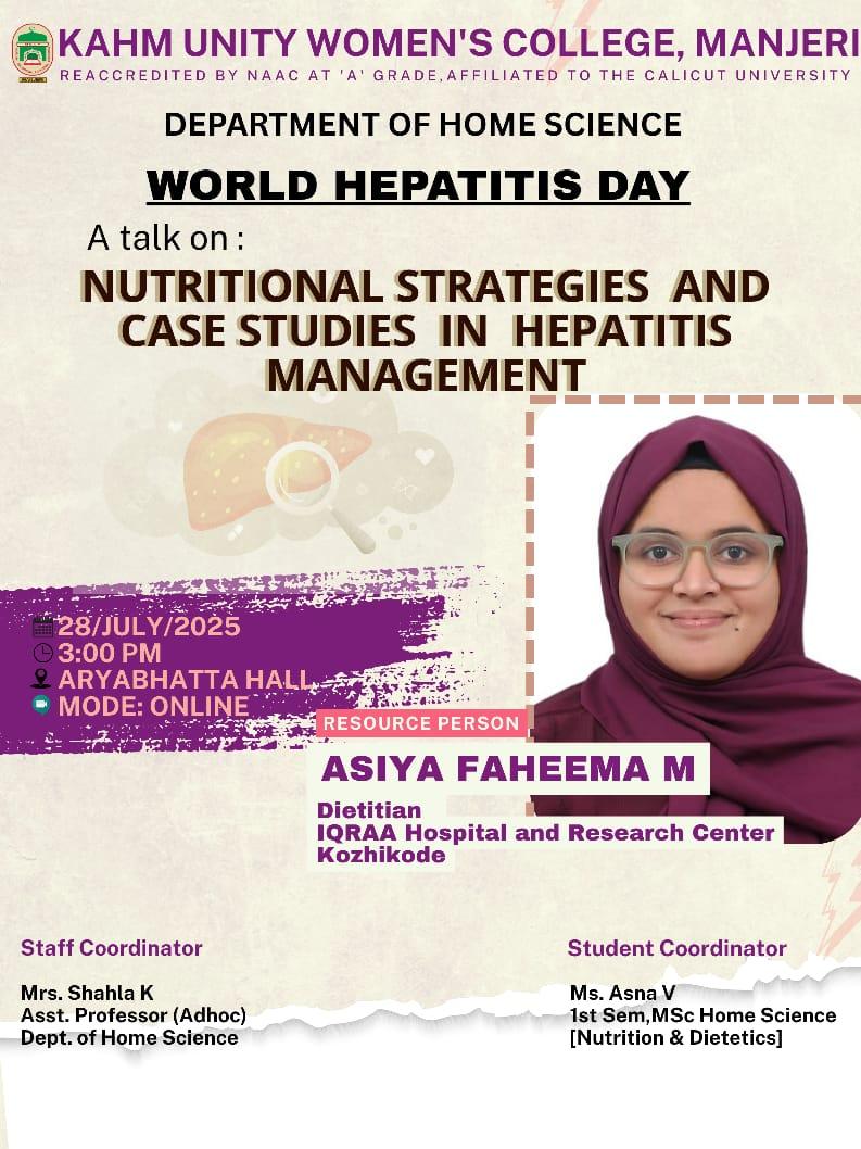 The PG Department of Home Science conducted an awareness class on World Hepatitis Day, 28th July 2025 at 3:00 PM in the Aryabhata Hall. This year’s Hepatitis Day carried the theme “Hepatitis Can’t ...