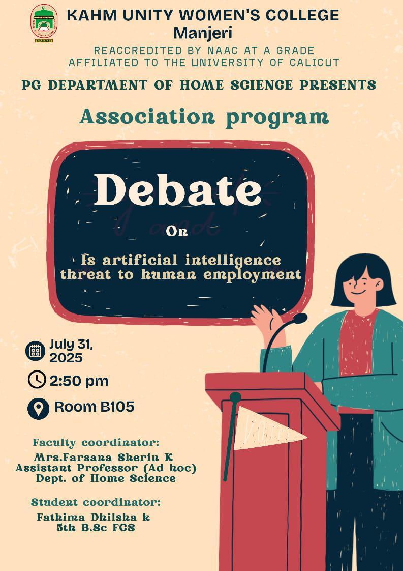 As part of the association programme, the Department of Home Science conducted a debate competition on the topic " Artificial Intelligence: Threat to Human Employment " on July 31st , 2025 at Room no. B 105 . The aim of ...