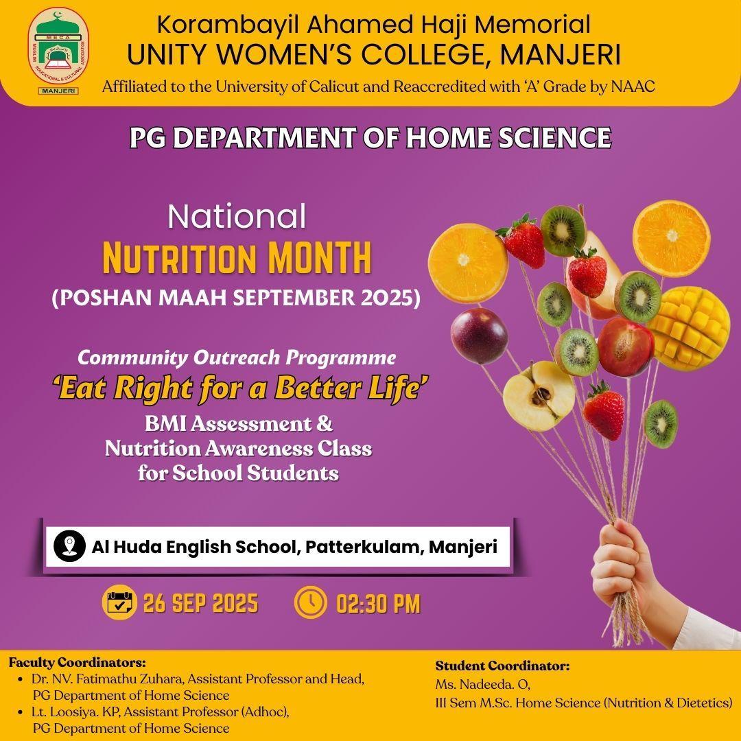 As part of the National Nutrition Month (Poshan Maah, September 2025) celebrations, the PG Department of Home Science, KAHM Unity Women’s College, Manjeri organized a BMI assessment and nutrition awareness class ...