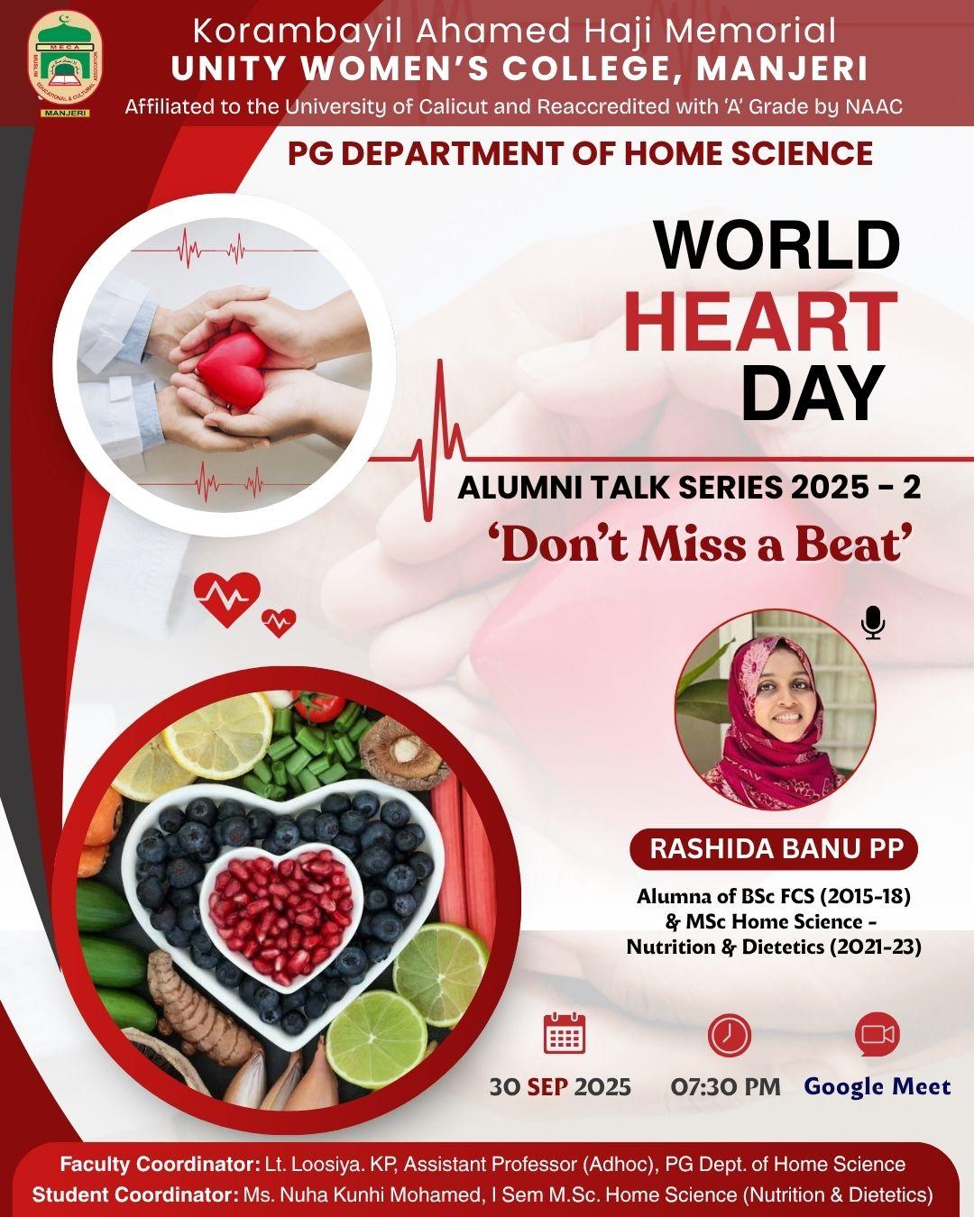 As part of the observation of World Heart Day, the PG Department of Home Science organized Alumni Talk Series 2025 - 2 on 30th September 2025 via Google Meet at 7:30 pm. The aim of the talk was to create awareness about ...