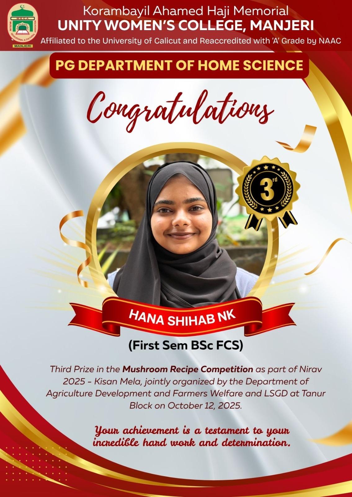 "Congratulations to Hana Shihab NK (First Sem B.Sc. FCS) for securing Third Prize in the Mushroom Recipe Competition at Nirav 2025 – Kisan Mela. 🌿 Your talent and hard work truly shine!"